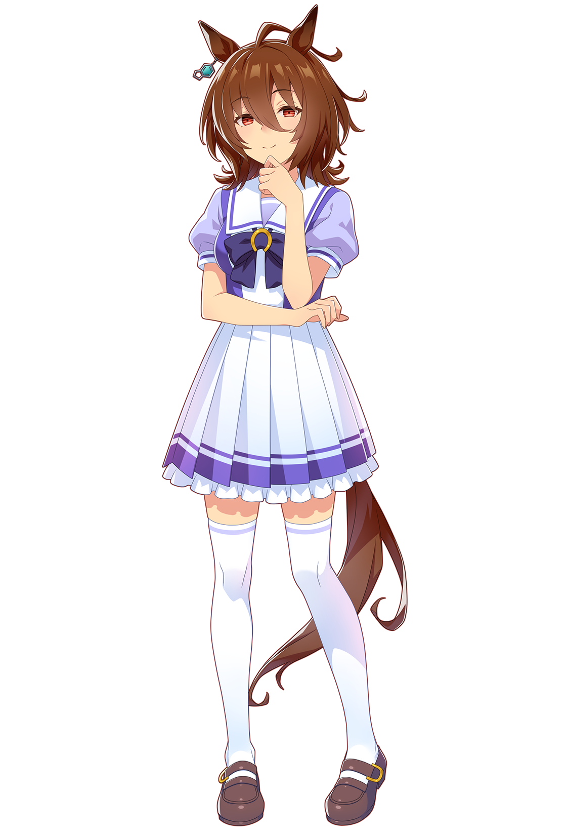 Agnes Tachyon is a short, young woman, who also has fair skin, and short, messy brown hair with a prominent ahoge bent backwards at an odd angle with horse ears. Also has red eyes with conspicuously missing "eyeshine" that are 'marked' with, strange, horizontal grid-like patterns. Tachyon also wears a single earring on her right horse ear in the shape of the chemical structure of indane
