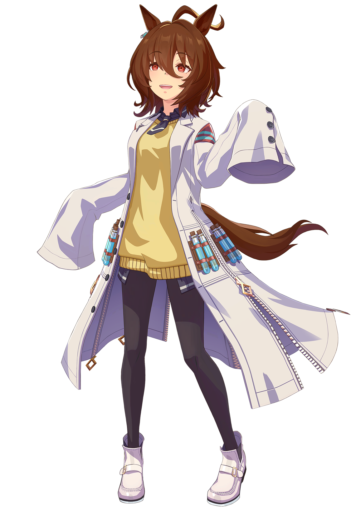 Tachyon's most salient trait is her long lab coat, worn as part of her racing outfit. This labcoat has so-called "moe sleeves" running past her fingers, as well as striped patches on the upper sleeves. The hip section of the coat is adorned, and detailed with two pairs of 'throwing bandoliers' filled with corked test tubes containing a mysterious glowing blue liquid.