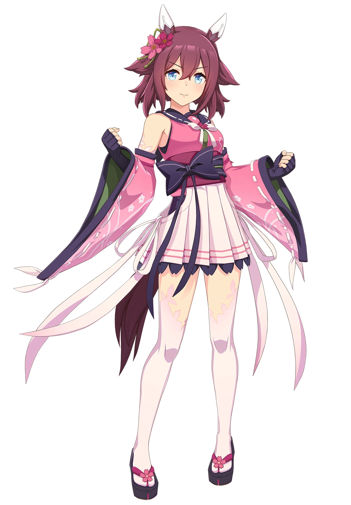 Sakura Chiyono O is an umamusume who has short brown or dark pink hair as well as blue eyes. She wears an okobo with a unique ear caps as well as a cherry blossom hair ornament close to her right ear.